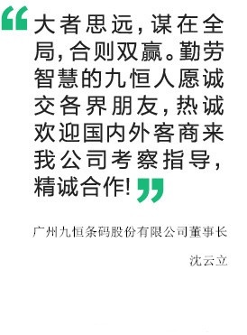 二十年的創(chuàng)業(yè)歷程,九恒始終秉承“誠(chéng)信、團(tuán)結(jié)、學(xué)習(xí)、開拓”的企業(yè)精神,遵循"卓越服務(wù)是我們的承諾,零缺陷是九恒的追求”的企業(yè)質(zhì)量方針,使九恒從無(wú)到有、從小到大、如今已成為中國(guó)最具知名度的條碼印刷企業(yè),隨著全球經(jīng)濟(jì)的一體化,中國(guó)企業(yè)正面臨著巨大的挑戰(zhàn)和機(jī)遇,在新一輪競(jìng)爭(zhēng)中,行業(yè)將按全球競(jìng)爭(zhēng)力標(biāo)準(zhǔn)重新洗牌,只有最優(yōu)秀的企業(yè)才能在未來(lái)的競(jìng)爭(zhēng)中生存。